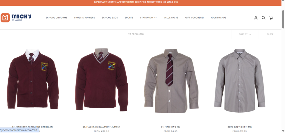 Uniforms can be purchased from Lynch’s of Marino - https://lynchschooluniforms.com/collections/st-fiachras-beaumont?srsltid=AfmBOord-x0ilVlaTPWFIqcxHhzhdthP2rwDzbrLUJYfvQ_yYWhfY1hI.